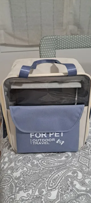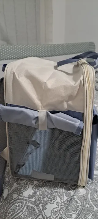 Transportín versátil para mascotas, ideal para perros o gatos. Su diseño combina funcionalidad y estilo. Esta nuevo a estrenar lo vendo porque mi perro le va pequeño. - Compartimento principal espacioso. - Bolsillo frontal con cremallera. - Malla transpirable en los laterales. - Asas de transporte resistentes.