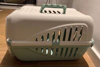 Transportín de gato o perro pequeño de plástico resistente, ideal para viajes con tu mascota. Cuenta con un asa superior para facilitar su agarre y rejillas laterales para ventilación. - Asa superior. - Rejillas de ventilación. Solo está usado una vez cuando mi gato era pequeño, y ya no lo uso ya que mi gato no cabe en ese transportin ni sale de casa, esta completamente nuevo, para más información hablame por privado