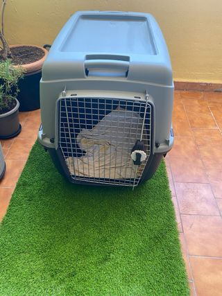 Transportín Gulliver Trixie IATA para perros de tamaño XXL. Ideal para viajes y desplazamientos. - Homologado para viajes aéreos (IATA). - Puerta metálica con cierre de seguridad. - Ventilación en todos los laterales. Tamaño XXL 104*72*72 Está bastante usado, la puerta a veces se atasca pero sigue pudiendose usar. Nuevo cuesta más de 130€