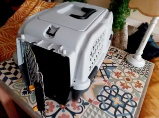 transportín de alta gama, muy robusto y homologado para viajar en avión (IATA). Es un modelo grande, ideal para perros medianos o varios gatos. Medidas: 76 cm (largo) x 47 cm (ancho) x 56 cm (alto). Desperfectos: La parte superior tiene bastantes rayajos y marcas de roce oscuras. Presenta zonas de plástico con textura rugosa/blanquecina por el uso y uno de los clips laterales tiene marcas de mordida/desgaste (ver fotos detalle)
