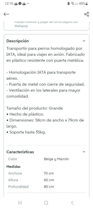Tengo dos transportines, cada uno a 75 euros. Tengo uno negro y uno beige, mismas dimensiones! En la última foto se aprecia que el enrejado esta oxidado, es el unico defecto que tienen! Transportín IATA para perro, apto para vuelos nacionales e internacionales. Medidas: 105x71x74 cm, peso 13 kg. Puerta y rejas metálicas con aperturas <25 mm, plástico resistente, tornillos y mariposas para armar y desarmar fácil. Ventilación incluida. Ideal para razas grandes y medianas: Labrador, Golden chico, Dálmata, Pastor australiano, Rottweiler chico, Husky, Border collie, Pitbull. Cumple normas IATA y aprobado por todas las aerolíneas.