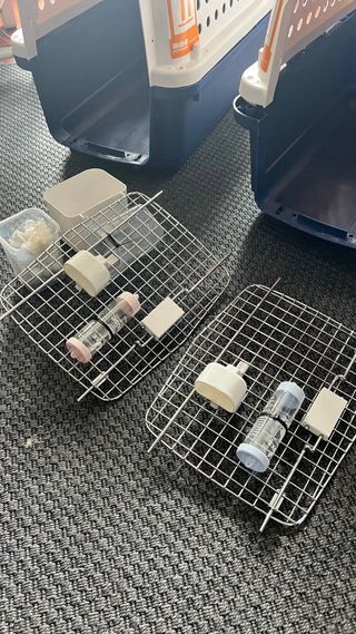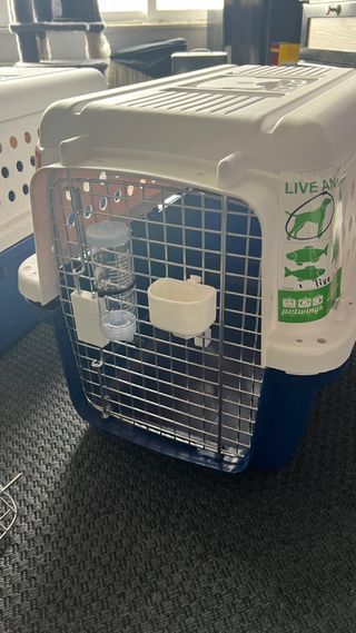Transportines para perros de tamaño grande, homologados para viajes IATA. Son robustos y seguros para el transporte de mascotas. - Diseño combinado en gris (raza grande) y blanco (muy grande max IATA) - Rejillas de ventilación para una buena circulación del aire. - Llevan su bebedor de agua y pestañas para seguridad. Gris dimesiones: 1 m de largo por 60 cms de ancho y altura 70 cms. Coste: 50 euros. Azul dimensiones: 1,15 de largo por 65 ancho y altura 80 cms. Coste: 100 euros. Estos transportines han sido usados una vez, viaje de latam a España con Aireuropa.