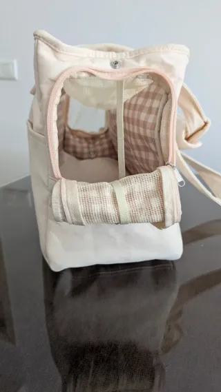 Transportín para perros pequeños, ideal para llevar a tu mascota contigo. - Diseño elegante y funcional. - Abertura superior con cremallera y aberturas laterales para que no se agobie. - Asas acolchadas, máxima comodidad - Bolsillos exteriores. - Interior forrado con tela de cuadros y cojín para que vaya muy cómodo - Sistema de seguridad interior para enganchar arnés Valido para cachorros y perros hasta 3,5 kilos.
