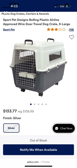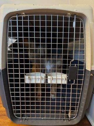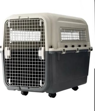 Transportín para perros de tamaño mediano a grande. Tipo podenco o coquer y que vayan cómodos. -Tiene dos asas superiores - Puerta frontal de rejilla metálica. - Ruedas de quita y pon - Ventilación en los laterales. Le faltan algunos enganches laterales pero como de todas formas debe llevar los tornillos de seguridad no es un problema. Es perfectamente funcional y se ha usado en varios vuelos.