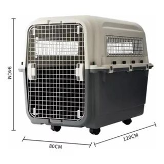 Transportín robusto y espacioso para perros grandes, con ruedas para facilitar su movilidad. - Dimensiones: 120cm (largo) x 80cm (ancho) x 94cm (alto). - Puerta frontal de rejilla metálica. - Ventilación en varios laterales.