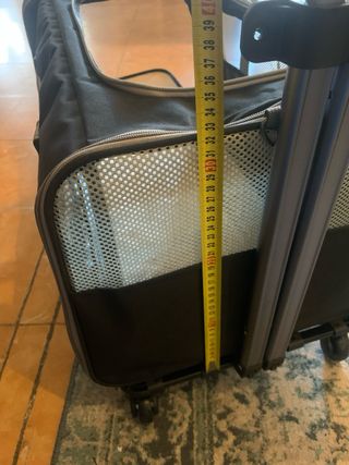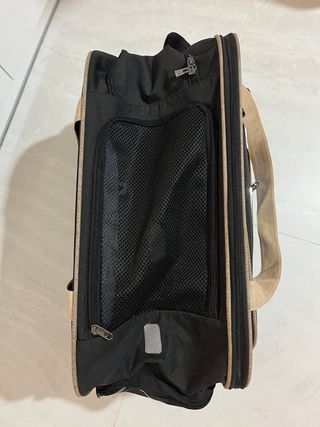 Transportín para mascota tipo mochila, cómodo y ligero, ideal para perros pequeños o gatos. ✅ Buena ventilación ✅ Base firme ✅ Tiene un asa telescópica y ruedas que se pueden desmontar. ✅ Aprobado para uso en cabina del avión Lo dejamos unos días con nuestro perro para que se acostumbrara y no le cogiera miedo al transportín, y acabó mordisqueando la cremallera superior, por lo que está rota. El resto del transportín está a estrenar, con plastico y todo. No lo llegamos a usar. Lo ideal es cambiar la cremallera o hacer algun apaño. Precio nuevo fueron 65€