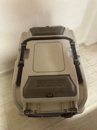 Transportín con 4 ruedas para perros SKUDO 4 68 x 48 x 51 cm. Tiene cuenco para bebida o comida. Transportín muy resistente a los golpes y a las altas temperaturas, para transportar a tus mascotas siempre que viajes. Material resistente y duradero. Dispone de una puerta con rejilla metálica para una buena circulación del aire. T Transportín para perros homologado por la IATA (International Air Transport Association). Con 2 bandejas de almacenaje. Con asa confortable para tirar Usado una vez.