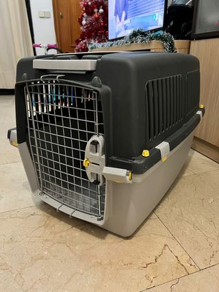 Transportín para perros de tamaño extra grande, ideal para viajes. Está en perfecto estado y listo para usar. - Medidas: (Añadir medidas si se conocen) - Material resistente y ligero. - Puerta metálica con cierre de seguridad. - Asa de transporte.