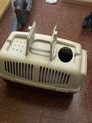 Transportín de plástico resistente para perros o gatos. Ideal para viajes o visitas al veterinario. Usado solo una vez para llevar nuestro perrito a casa y al veterinario. - Asa superior para un fácil agarre. - Puerta metálica con cierre de seguridad. - Rejillas laterales para ventilación.
