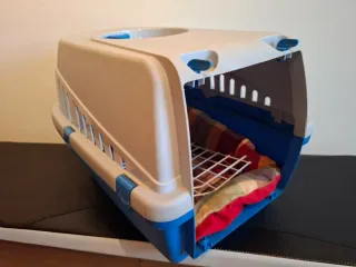 Transportín rígido para perro pequeño o gato. Medidas aprox: 60 x 31 x 30 cm. Con puerta metálica y cojín interior. En muy buen estado, limpio y sin roturas. Usado solo un par de veces para viajes en avión y coche. Ideal para viajes, veterinario o transporte seguro de tu mascota. Entrega en mano en Barcelona.