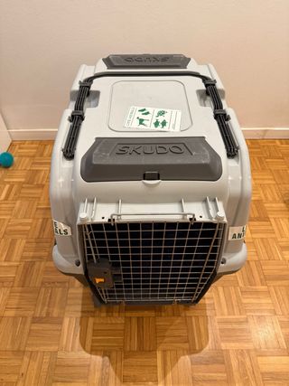 Transportín SKUDO 5 original, en muy buen estado. Ideal para perros medianos a grandes. Medidas: 79 × 58 x 65 cm (o Recomendado para perros aprox. 20-30 kg (según tamaño del animal) ** Apto para viajes en avión: cumple con la normativa IATA 6 Apto para coche Puerta metálica resistente Buena ventilación en todos los lados Transportín robusto, seguro y cómodo para el animal. Trae ruedas para transporte mas fácil y cómodo. Trae un almohadón hecho a medida para mas comodidad del perrito. A una de las bisagras le falta unas pletinas pero igualmente cierra bien.