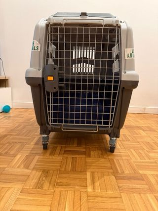 Transportín de plástico resistente para perros grandes. Sirve como jaula o caseta. Cuenta con una puerta de rejilla metálica y un asa superior para facilitar su transporte. - Puerta de rejilla metálica. - Asa superior. - Ventilación en los laterales. Solo se ha usado una vez para un transporte en avión.