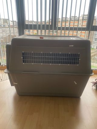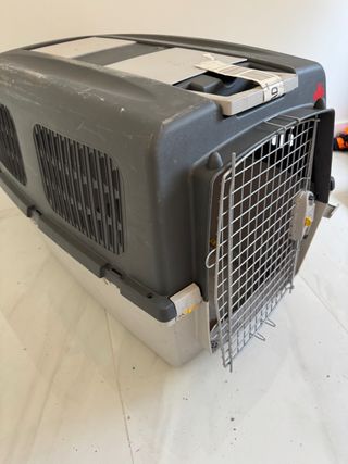 Transportín robusto para perros de tamaño grande, como un pastor alemán. Ideal para viajes o como espacio seguro. - Puerta de rejilla metálica con cierre. - Asa superior para facilitar el transporte. - Ventilación en los laterales. -Tiene un pequeña rotura en la parte superior