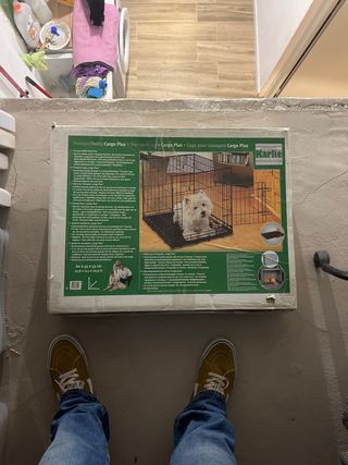 Transportín para perros en buen estado, aunque con algunas señales de uso. Ideal para viajes con tu mascota. - Medidas: (Añadir medidas si se conocen) - Material resistente. - Puerta metálica con cierre de seguridad. - Asa superior para facilitar el transporte.
