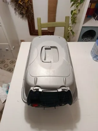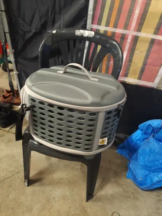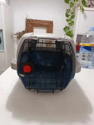 Transportín para mascotas pequeñas, ideal para perros o gatos. Su diseño permite una buena ventilación. - Color azul y gris. - Incluye un recipiente interior. Un poco sucia, pero puede quedar impecable.