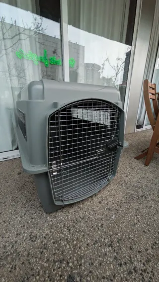 Transportín robusto y seguro, ideal para viajes de perros grandes. - Homologado para transporte aéreo y viajes internacionales. - Fácil montaje y almacenamiento gracias a su parte superior, tacones y puerta desmontables. - Puerta de rejilla metálica. - Incluye comederos. - Señalizado para Live Animals y This Side Up.