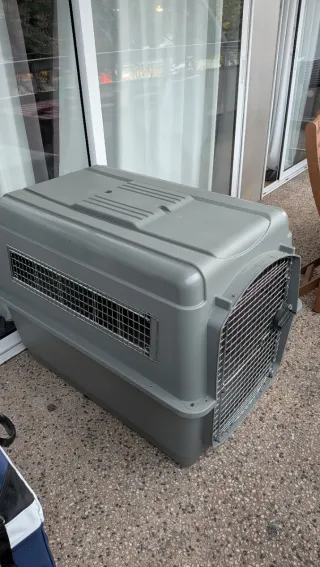 Transportín para perros de tamaño grande. Es robusto y cuenta con ventilación. - Parte superior gris. - Base negra.