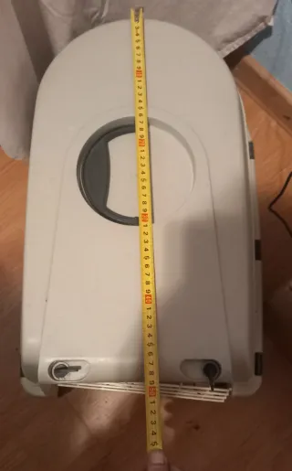 Transportín para una mascota pequeña (hasta 7 kg), con mango telescópico, asa, dos bolsillos laterales, cortinas enrollables, rejillas de ventilación, correa amovible para llevar en el hombro y cuatro ruedas. Medidas por fuera: 40x25x30 cm. Con bastante uso y evidentes signos de desgaste por fuera (ver fotos). Dentro está impecable y todas las cremalleras se cierran y se abren bien. La tela y la alfombrilla de dentro se fijan con velcro, se puede lavar. Las ruedas están bastante desgastadas, quizá se puede cambiar. Aún puede servir para llevar a la mascota dentro del coche, por ejemplo.