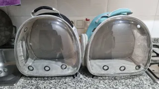 Mochila transportín para mascotas con diseño de burbuja. - Ventilación a través de agujeros. - Asa superior para fácil agarre. - Interior espacioso para el confort de tu mascota. IMPORTANTE: como transportin va genial, pero despues de una visita al vet tuvimos que ponerlo en cuarentena unos 15 dias a falta de jaula para cuarentena lo paso en el transportin y el estres/aburrimiento lo hizo atacar la puerta y le tomó al menos 6 dias . HAY QUE HACERLE LA REPARACION DE LA MALLA. 10€ cada una, los accesorios y el pollo no vienen incluidos