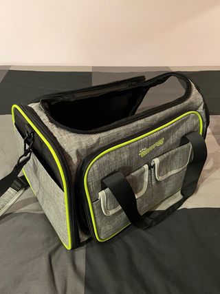 Transportín para gatos o perros pequeños en perfecto estado. Tamaño: 41 x 26 x 25 cm - Diseño moderno con detalles en verde lima. - Malla transpirable en varios lados. - Base acolchada para mayor comodidad. - Cierre de cremallera. - Asas de mano y correa para hombro.