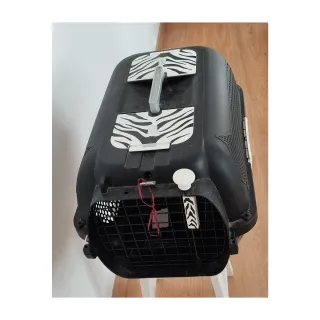 Transportín de plástico resistente con un diseño moderno y detalles en estampado cebra. - Asa superior para facilitar el transporte. - Rejillas de ventilación en los laterales. - Cierre seguro.