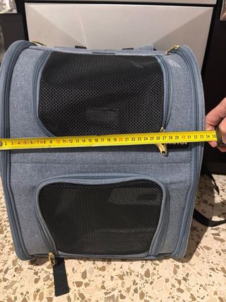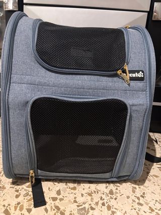 Transportín convertible para mascotas, prácticamente nuevo. Es un accesorio muy práctico para viajar con tu animal. - Diseño convertible. - Color beige con detalles en azul. - Desplegado mide de fondo el doble. - Pedir mas fotos si es necesario.