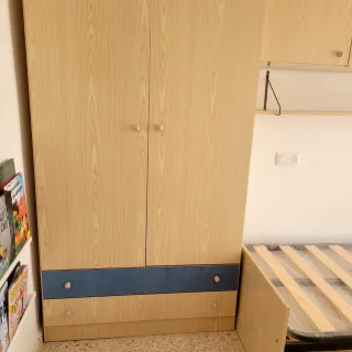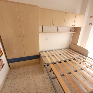 Conjunto de muebles para habitación infantil, juvenil. - Armario de madera con puertas. - 2 camas (de 90x190cm) con somier de lamas de madera (no incluye los colchones) - Una cama se guarda debajo de la otra. - Estantería superior. Recoger en Trigueros