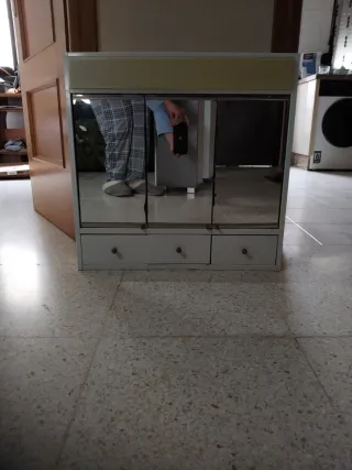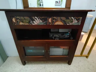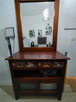 Mueble de madera maciza con espejo. - Cajón con diseño decorativo. - Compartimento inferior con puertas de cristal.