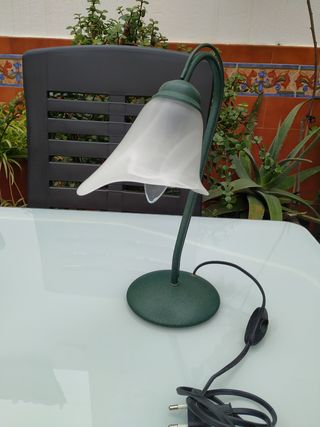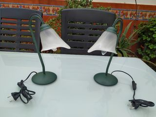 2 lámparas de mesita de forja color verde hierba y tulipas blancas de cristal en forma de flor. Cable de enchufe en color negro. Se entregan sin bombillas. Muy buen estado.