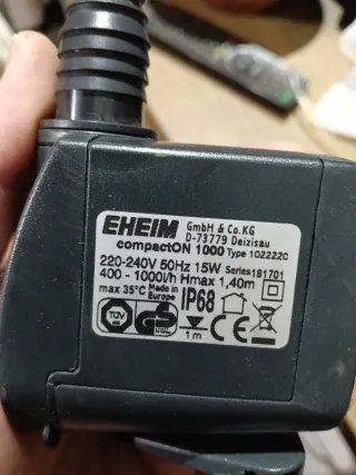 Bomba de agua de la marca Eheim, diseñada para acuarios y peceras. Cuenta con un diseño compacto y un conector estriado para mangueras. - Marca: Eheim - Color: Negro y gris - Conector estriado - De 400/1000lh