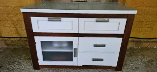 Mueble de diseño hecho a mano, perfecto para tu salón. - Combinación de acabados en blanco y madera. - Incorpora un compartimento acristalado. - Dispone de varios cajones para almacenamiento.