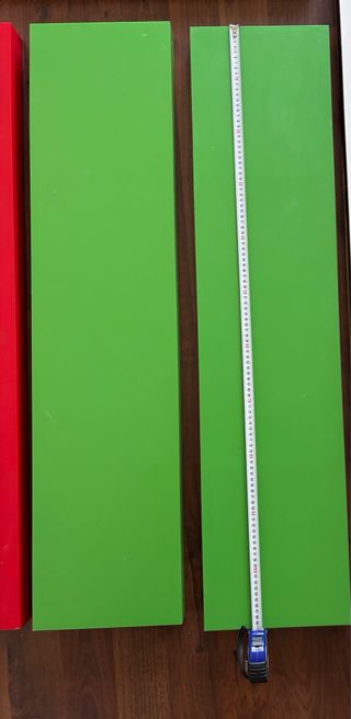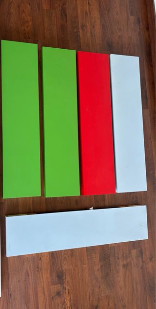 Conjunto de baldas de madera de Ikea en varios colores. - Colores disponibles: azul, verde y rojo. Largo 110 cm. Ancho 26 cm y grosor 5 cm. 20 € todas. Por separado: 5€. No se hace envío.
