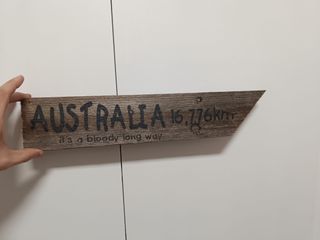 Señal decorativa de madera con la inscripción Australia y la distancia. Comprada en Australia como souvenir. Diseño rústico. - Texto: AUSTRALIA 16,776km it's a bloody long way.