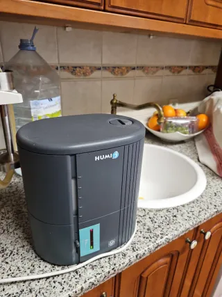 Humidificador S&P modelo Humi 3 en color gris. - Diseño cilíndrico. - Indicador de nivel de agua. - Salida de vapor superior.