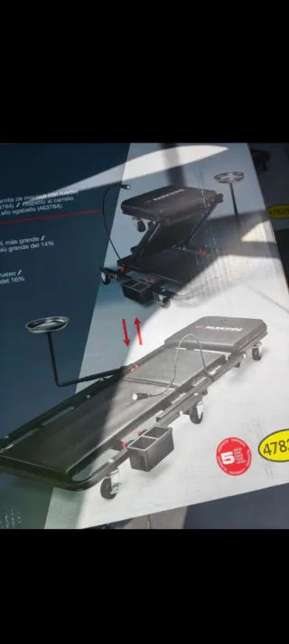Camilla plegable de rendimiento. - Estructura metálica. - Asientos acolchados. - Ruedas para facilitar el transporte. Con imán brazos extensibles y cazos para tornillos