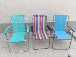 LOTE 3 sillas plegables 21 €. Sueltas 9 € cada una. Perfectas para llevar a la playa, usar en el jardín o en la huerta. Ideales para romerías y chiringuitos. Son muy prácticas y fáciles de guardar: - Medidas estándar: alto 70 cm, ancho 54 cm medida total exterior, profundo 7 cm plegada y 50 cm abierta. - Estructura de metal y plástico. - Asiento y respaldo de tela.