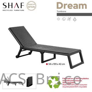 Tumbona Dream Antracita Abrir galería de fotos del producto para ver fotos reales La tumbona Dream, tiene un diseño cómodo con un respaldo de 4 posiciones ajustable, y un cojín suave para disfrutar de momentos de relajación en exteriores. Sus 2 ruedas permiten transportarla sin esfuerzo, y es ideal para ahorrar espacio y guardarla en cualquier lugar porque se puede plegar fácilmente. Fabricada en España con material de plástico reciclado resistente a los rayos UV y las condiciones climáticas adversas. *Disponible en color antracita y wengué. La tumbona Dream tiene un cómodo y duradero diseño que cuenta con un respaldo ajustable e...