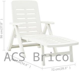 Tumbona Plegable Smeraldo con Ruedas Blanca Abrir galería de fotos del producto para ver fotos reales Tumbona plegable con respaldo multiposición y equipada con ruedas. Fabricada en resina de alta calidad, resistente a la intemperie y a los rayos UV. Muy fácil de abril y plegar, práctica y funcional, perfecta en el jardín, junto a la piscina en el camping incluso en la playa. CARACTERÍSTICAS TÉCNICAS: - Fabricada en polipropileno - Respaldo multiposición - Diseño de color blanca. - Plegable con ruedas - Medidas: 72x189x96 cm - Peso: 10,40 kg Para presupuestos personalizados de más de 3 unidades, solicitar en info@acsbrico.com
