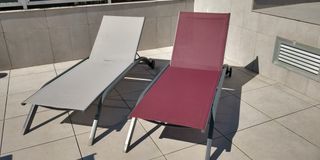 Tumbonas de color gris y burdeos con cojines enrrollables marca Hesperide. Aluminio. Se puede abatir en 5 posiciones. Son apilables para que sea más cómodas de guardar y sus medidas son de 2 m largo x 36 cm de alto x 80 cm de ancho. Solo pesa 5 kg. Precio nuevas con cojín 140 € cada una (280€)