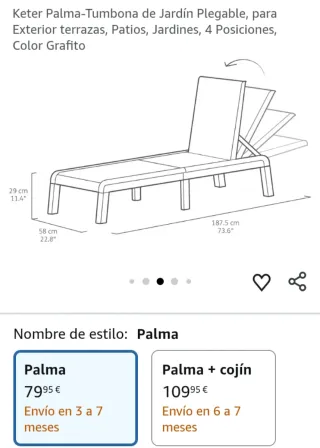 Nota: Una unión está rota, pero no afecta al montaje de la tumbona, se sostiene bien con una.! Keter Jaipur-Tumbona de Jardín plegable, para Exterior terrazas, Patios, Jardines, Color Gris Marca Keter Color Grafito Material Liso Dimensiones del producto58f. x 187an. x 29al. centímetros Tamaño58 x 187 x 29 cm Peso del producto8,8 Kilogramos Respaldo reclinable con tres posiciones para mayor confort.