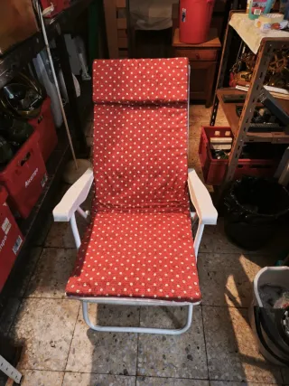 Tumbona de playa con un diseño a cuadros llamativo. Es perfecta para relajarse al aire libre. - Estructura metálica y de plástico. - Tapizado de tela resistente. Precio negociable