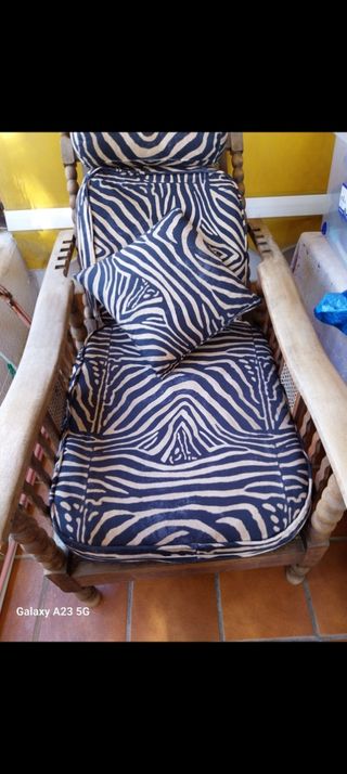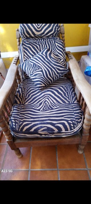 Tumbona de madera de Teka con sus cojines de cebra. Buenas condiciones.. falta mano de barniz. Vale para interiores