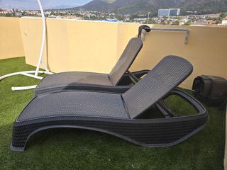 Hamacas articuladas marca Tiffany Kettler (alemanas ) con reposabrazos color blanco ,material muy sólido y duradero . Se vende sin cojines. Compradas en la tienda KETTAL Marbella. Precio no negociable. Tendrás hamaca para muuuuchos años. Son dos. Tienen una bandejita lateral junto al reposabrazos para bebidas,y un cajón en respaldo. Las colchonetas las regalo si las quieren. El color está desteñido por el sol y pequeñas manchas de humedad pero si hay alguien habilidoso ...las puede retapizar,son las originales, las regalo .NO ENVIO