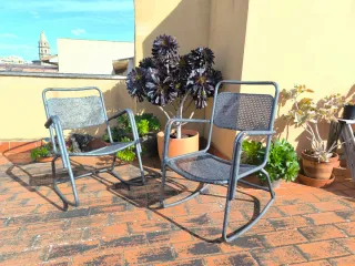 Conjunto de dos mecedoras de estilo vintage, perfectas para dar un toque especial a tu terraza o jardín. Su diseño atemporal las hace ideales para cualquier espacio exterior. - Estructura robusta de metal. - Asiento y respaldo de malla metálica. - Diseño curvo para un balanceo suave.