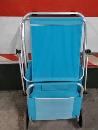 Tumbona de playa que sirve también como carrito para transportar cosas. Se puede doblar para ahorrar espacio.