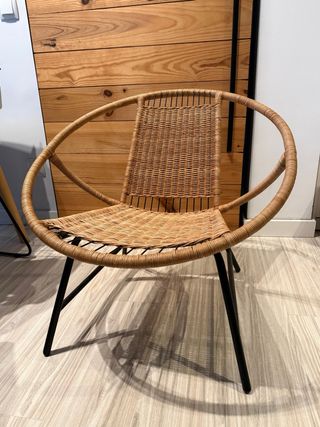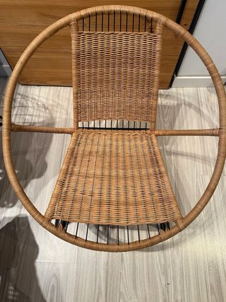 Silla como nueva de ikea, con un diseño moderno y circular, combinando materiales naturales y metálicos. - Estructura circular. - Patas metálicas negras.