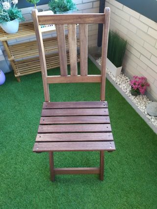 Preciosa silla plegable de madera de teka. Le hace falta una mano de barniz para proteger y dar brillo a la madera. Ideal para espacios pequeños o terrazas. - Estructura robusta y resistente. - Diseño clásico y elegante. - Se pliega fácilmente para facilitar su almacenamiento.