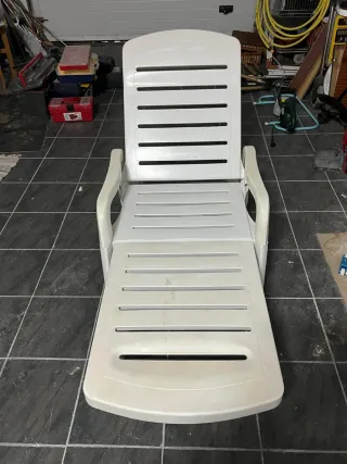 Tumbona blanca para jardín o piscina. Está en buen estado, aunque tiene algunas marcas de uso. - Ideal para relajarse al sol. - Cómoda y ligera. - Fácil de limpiar.