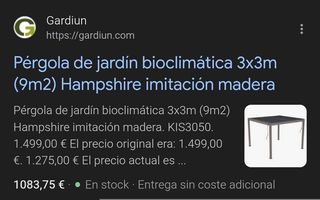Pérgola de jardín bioclimática 3x3m (9m2) Hampshire imitación madera Peso 120 kg Dimensiones 300 × 300 × 220 cm Marca Gardiun Alto total (cm) 220 Ancho total (cm) 300 Largo total (cm) 300 Peso (kg) 120 Material Aluminio Color Efecto madera veteada Superficie (m²) 9 Número de bultos 4 Peso bulto 1 (kg) 27,5 Medidas bulto 1 (cm) 236x25x23 Peso bulto 2 (kg) 52 Medidas bulto 2 (cm) 196x60x18 Peso bulto 3 (kg) 39 Medidas bulto 3 (cm) 145,5×23,5×20,5 Peso bulto 4 (kg) 35,5 Medidas bulto 4 (cm) 145,5×23,5×35,5