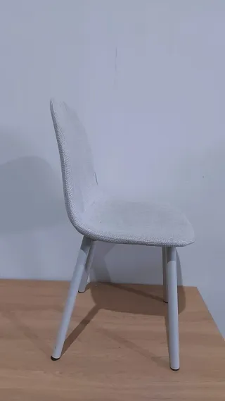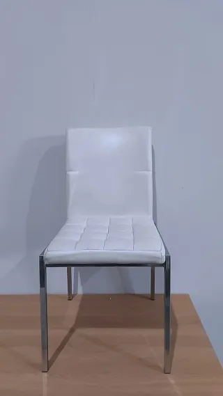 Conjunto de cuatro sillas de comedor con un diseño moderno y elegante. Perfectas para dar un toque contemporáneo a tu hogar. - Estructura metálica robusta. - Asiento y respaldo tapizados en polipiel blanca. - Patas plateadas. - Medidas: 42x42x90 cm.